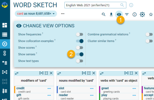 Look at the screenshot showing the collocations and the senses of the lemma card. Sketch Engine identified a total of 4 senses. Clicking on the senses hides or shows the related collocations. Collocations used with several senses and collocations which did not provide sufficient data for the sense to be reliably identified are marked “No sense”.