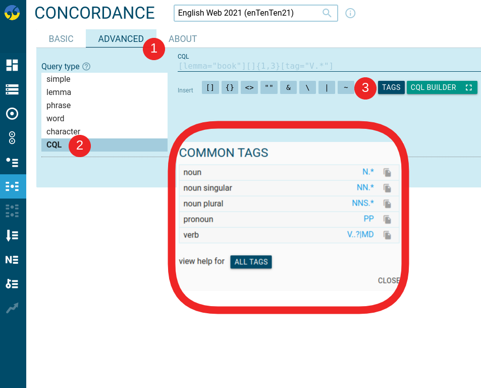 The configuration above will list 5 items in the Common tags table on the corpus info page as well as in Concordance (ADVANCED tab – Query type CQL – TAGS).