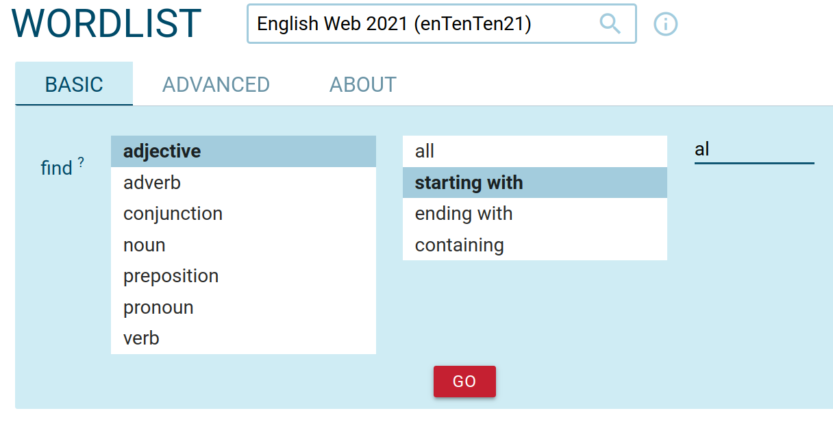 Part-of-speech selector available in word list, concordance, n-grams, etc.