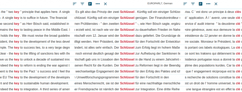 A parallel corpus consists of the same text translated into one or more languages. The texts are aligned (matching segments, usual sentences, are linked). The corpus allows searches in one or both languages to look up or compare translations.