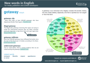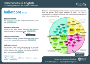 New words in English is a service for publishers, lexicographers and content developers to help them develop interesting and engaging content for their readers or users. The service delivers information about new and trending words in English discovered in the latest time-annotated linguistic corpora.