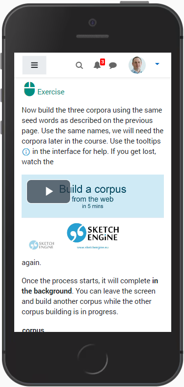 boot camp mobile interfaceThe course content and the Sketch Engine interface adjust to mobile devices. The course content is supported by mobile browsers and a dedicated app.