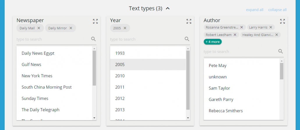 Meta data (or structure values) are automatically processed by Sketch Engine into text types, making it easy to set search criteria or build subcorpora from texts belonging to the same category.