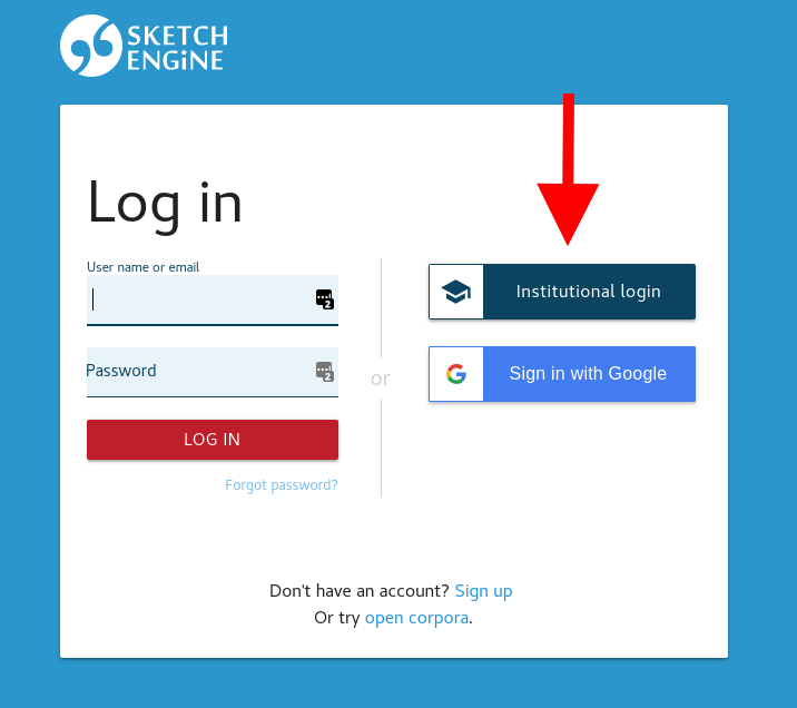 With Single sign-on (SSO) you do not need a Sketch Engine user name and password. Simply use your university or institutional login details. Your login details will not be shared with Sketch Engine.
