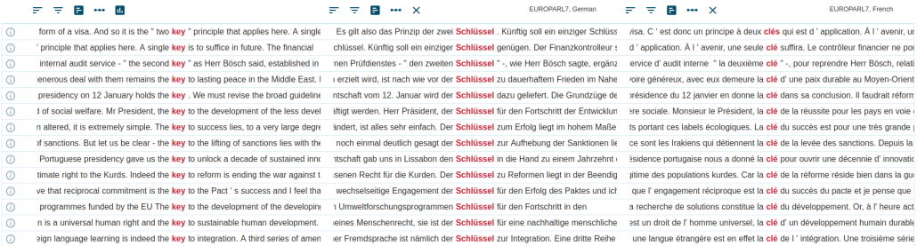 A parallel corpus consists of the same text translated into one or more languages. The texts are aligned (matching segments, usual sentences, are linked). The corpus allows searches in one or both languages to look up or compare translations.