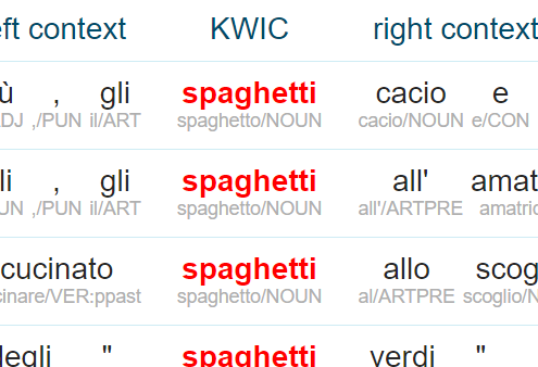 - Italian Web 2010 (itTenTen10) – 2.5 billion words (tagged by TreeTagger)