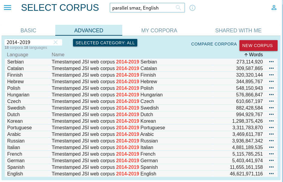 The corpora are excellent general use corpora with the added value of time stamps which facilitated the implementation of the trends feature to automatically identify new words or words whose use changes in time (trending words).
